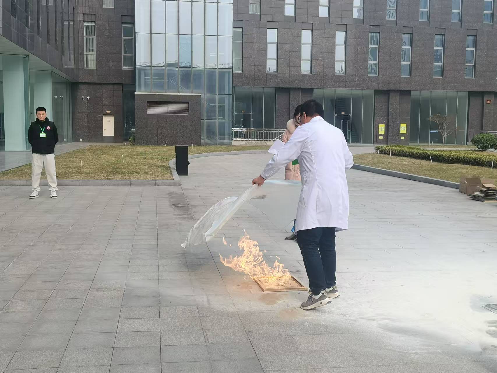 安全員講解了滅火毯的妙用——它能起到隔離熱源及火焰的作用,可用于撲滅油鍋火或者作為防護(hù)物品披覆在身上逃生。在火災(zāi)初期階段能快速隔氧滅火。
